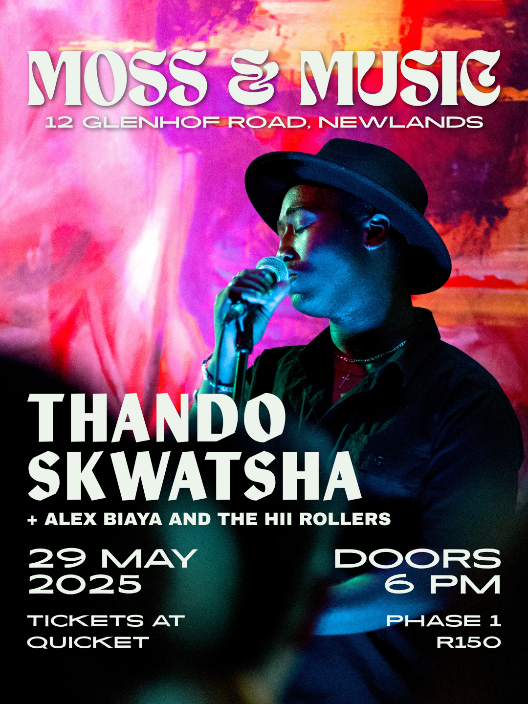 Today Thando stands at the threshold of a fresh chapter—rewriting, retelling and inventing new stories with sharper self-awareness and stricter boundaries than before. Backed by a growing Cape Town creative community, he is crafting music and live experiences designed as communal meals: nourishing, celebratory and unafraid to confront pain. Whether fronting a full band or leading a stripped-back prayer of voice and keys, Thando’s message remains constant—light floods in through every crack.